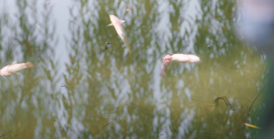 연못에 물고기 떼가 죽어있는 게 보이네요.